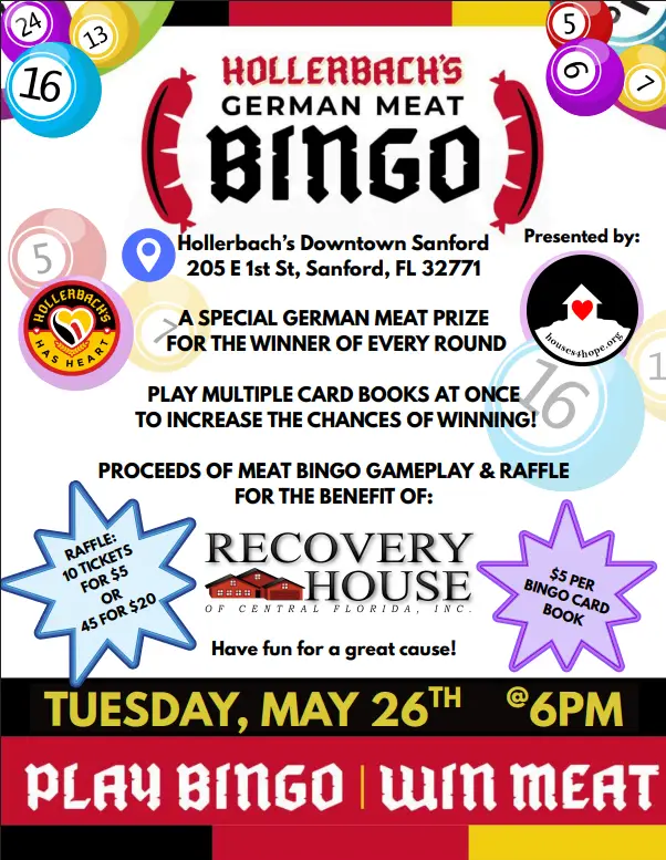 Join us at Hollerbach’s for a fun night of German Meat Bingo where every round brings a chance to win… and every dollar supports Recovery House of Central Florida.